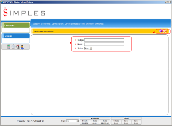 A tela do Cadastro de Bancos possui cinco elementos principais que executam funções distintas, conforme seguem: