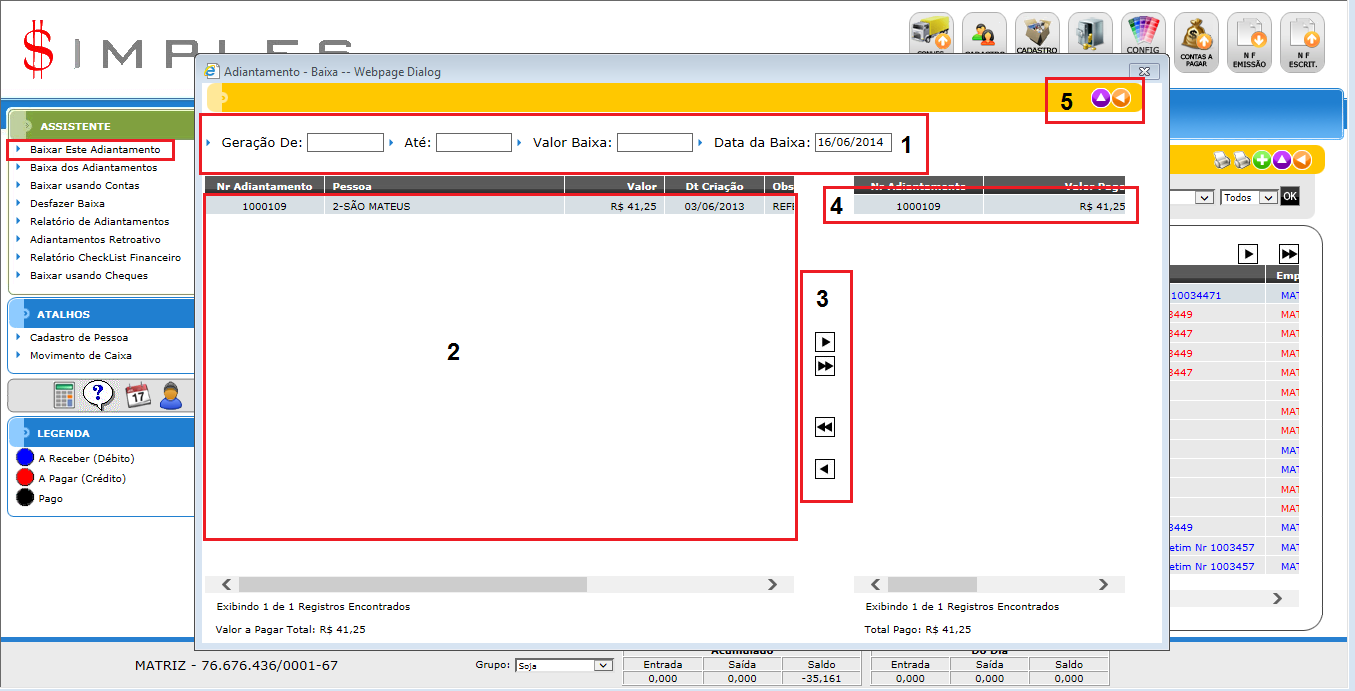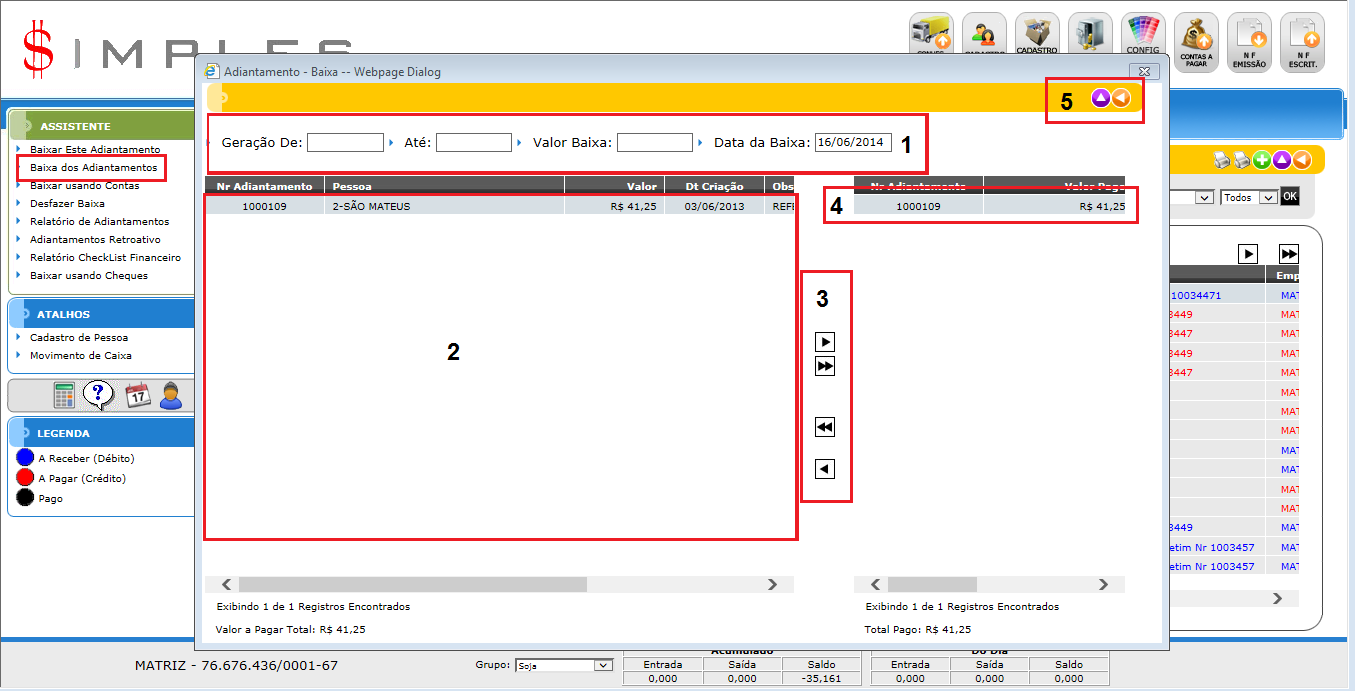 4. Pesquisa: Permite executar uma pesquisa usando o Número do Adiantamento.