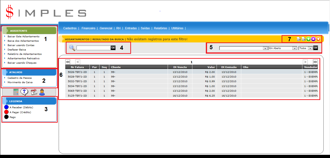 A tela de Adiantamentos possui sete elementos principais que executam funções distintas, conforme seguem: