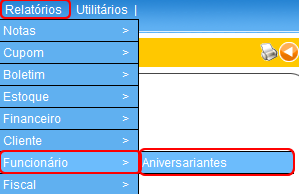 Para acessar este relatório é preciso ir ao Menu “ Relatórios-Funcionário-Aniversariantes”.
