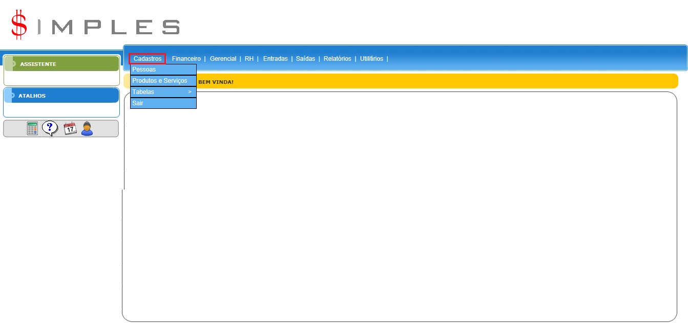O menu Cadastros agrega todos os cadastros, Pessoas, Produtos/Serviços e Tabelas.