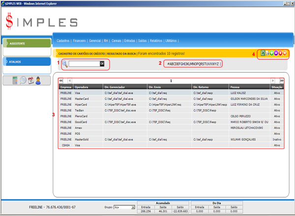 - Grade de Cartões de Crédito: Mostra todos os Cartões de Crédito conforme os filtros descritos anteriormente.