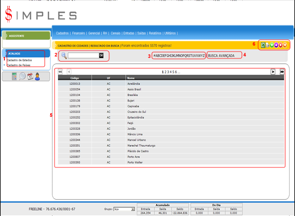 A tela do Cadastro de Cidades possui cinco elementos principais que executam funções distintas, conforme seguem: