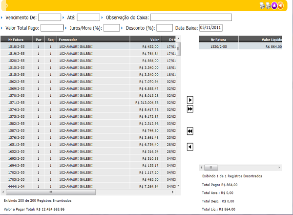 b) Quitação das Faturas: Para quitar várias faturas, clique em Quitação das Faturas na Assistente, ou clicar com o botão direito do mouse em cima de qualquer fatura. Irá abrir a mesma tela da opção anterior. Para selecionar diversar faturas, use os botões que se encontram entre as duas grades. A seta para a direita irá colocar a fatura selecionada para a outra grade. Em seguida basta clicar no botão Quitar Faturas Selecionadas no Navegador.