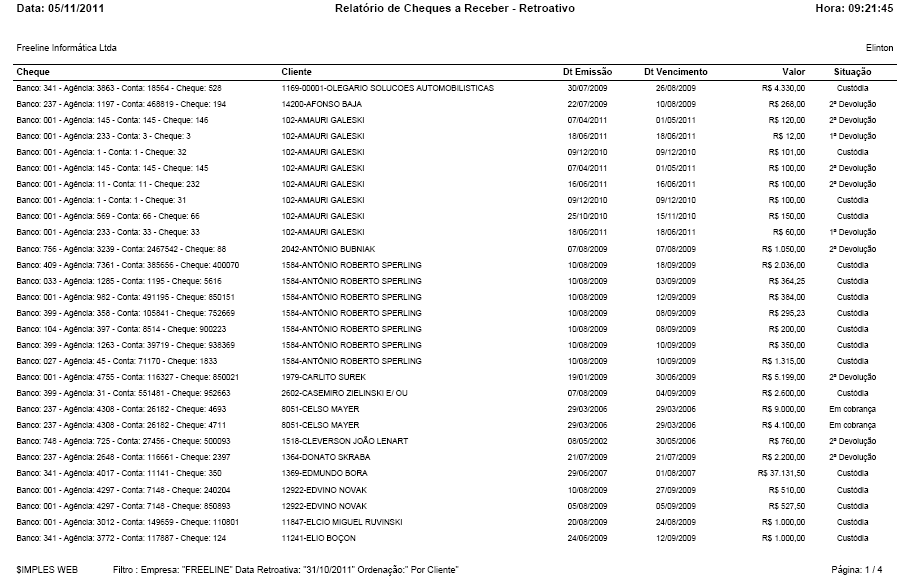 Para acessar este relatório é preciso ir ao Menu “ Relatórios-Financeiro-Cheques-Data Retroativa”.