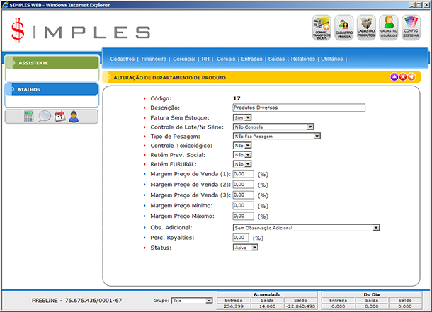 - Retém FUNRURAL: Indica se o departamento do produto tem imposto de FUNRURAL para a cobrança na emissão da nota fiscal;