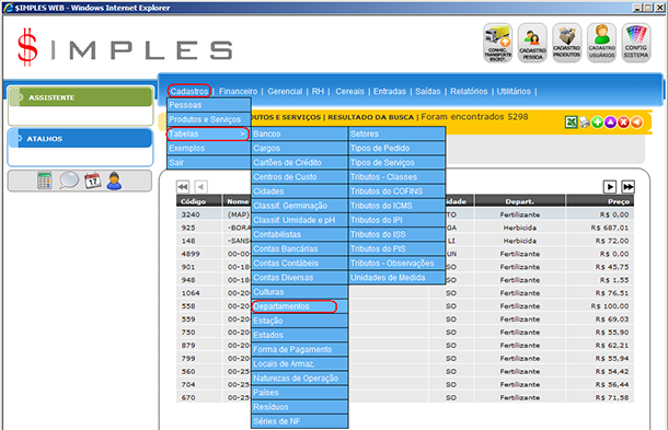Para acessar o Cadastro de Departamentos, use o Menu “Cadastro - Tabelas - Departamentos”. Será apresentada a tela principal do Cadastro de Departamentos.