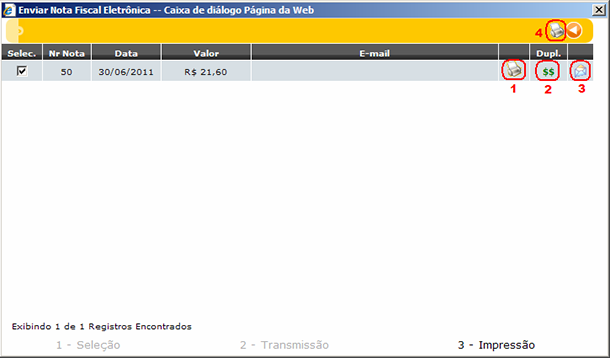 Na terceira fase, o sistema iniciará a transmissão do lote com as NF-es selecionadas. Nesta fase poderão ocorrer problemas de comunicação, seja por problemas na internet ou na própria SEFAZ. Neste caso o processo será abortado também mas não poderá ser reiniciado. Neste caso o usuário deverá acessar a opção de Reenvio da NF-e para corrigir o problema.
