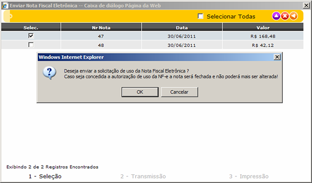 Caso tenha selecionado ao menos uma Nota Fiscal, uma mensagem de confirmação é apresentada. Observação: caso seja concedida a autorização de uso da NF a nota será fechada e não poderá mais ser alterada!