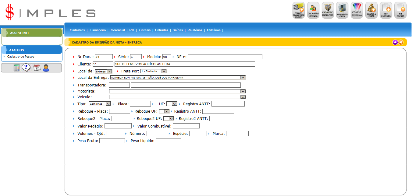 Logo depois do parcelamento da NF, terá que preencher informações sobre o transporte (motorista, placa, etc...).