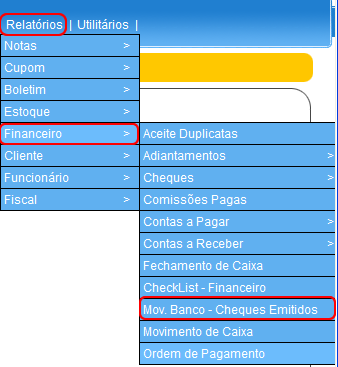 Para acessar este relatório é preciso ir ao Menu “ Relatórios-Financeiro-Mov. Banco – Cheques Emitidos”.