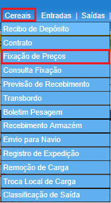 Para acessar Cereais - Fixação de Preços, use o Menu “Cereais – Fixação de Preços”.