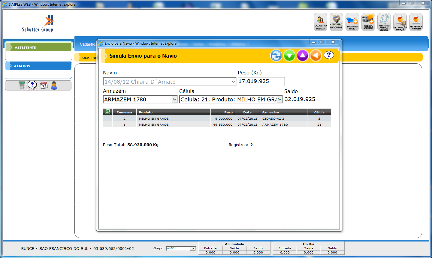 - Preenchimento das informações do navio, peso, armazém e célula. Ao final será mostrado o saldo total do pesso dos produtos nas remessas.