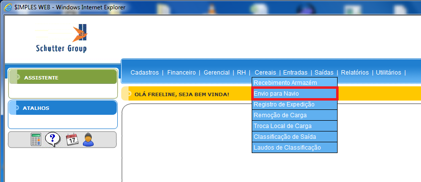 Para acessar Envio para Navio , use o Menu “Cereais – Envio para Navio”.