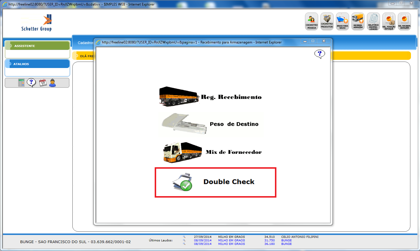 Para acessar o Double Check clique na quarta opção do menu Recebimento Armazém - "Cereais - Recebimento Armazém - Double Check"