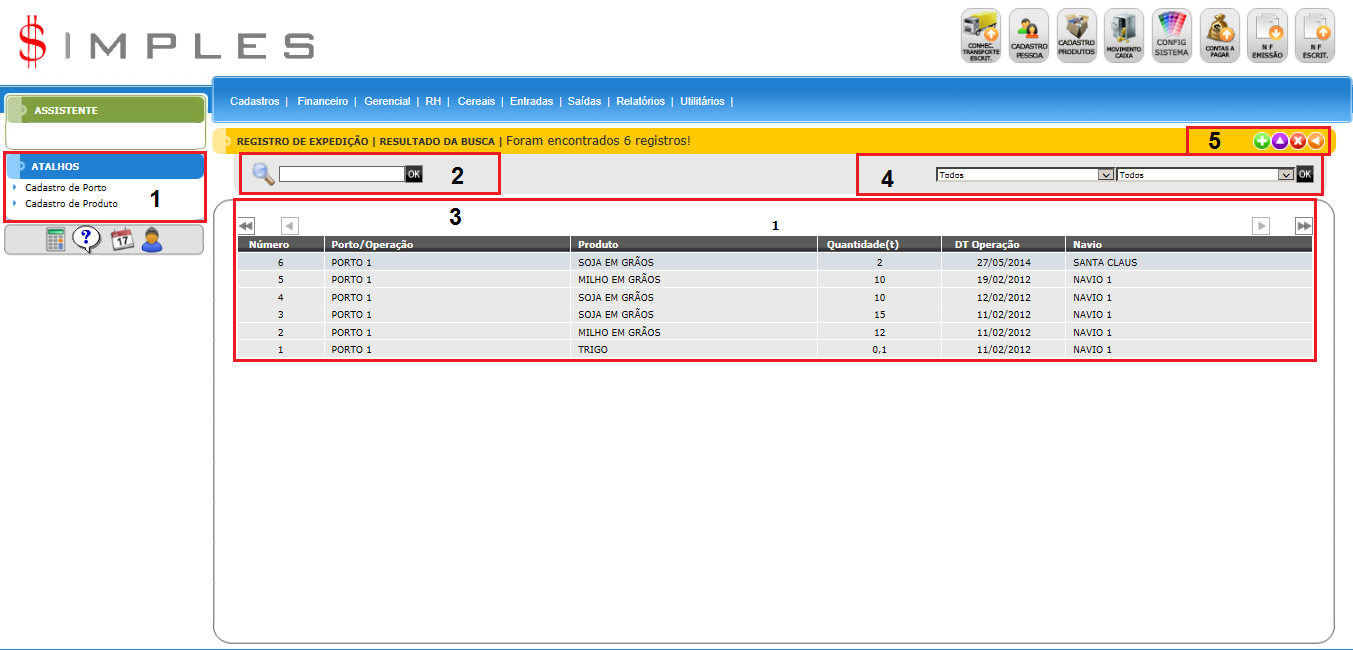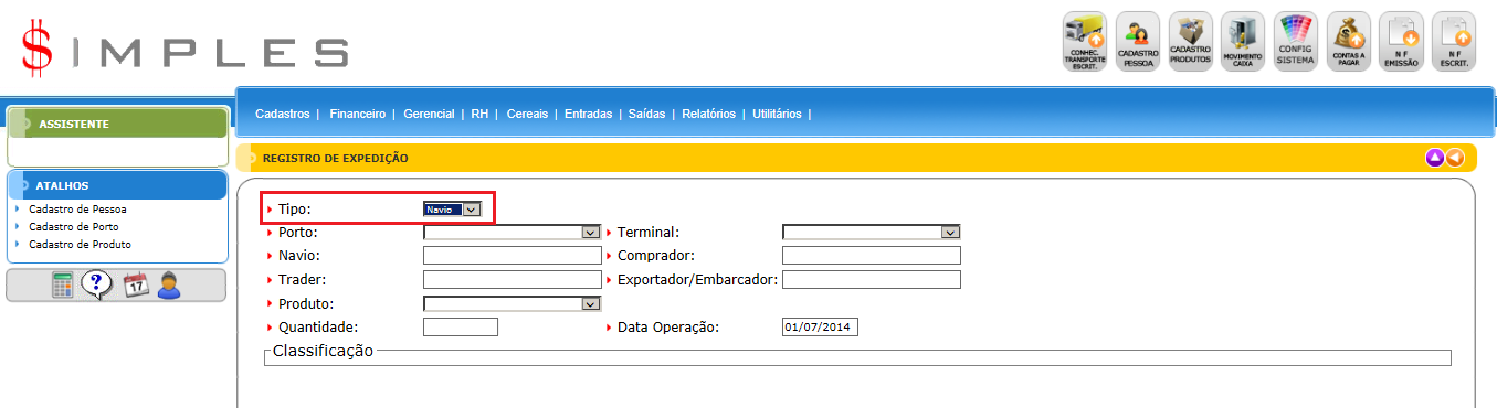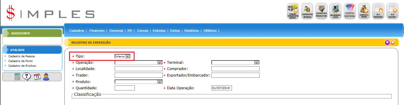 Para acessar Cereais - Registro de Expedição , use o Menu “Cereais – Registro de Expedição”.
