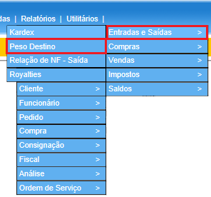 Para acessar este relatório é preciso ir ao Menu “ Relatórios-Notas/Cupons-Entradas e Saídas-Peso Destino”.