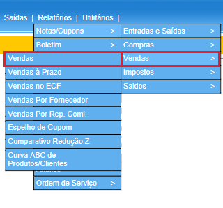 Para acessar este relatório é preciso ir ao Menu “ Relatórios-Notas/Cupons-Vendas-Vendas".