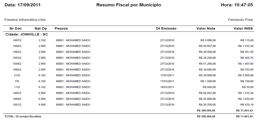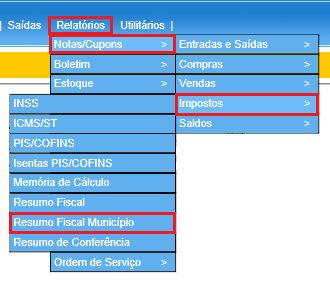 Para acessar este relatório é preciso ir ao Menu “ Relatórios-Notas/Cupons-Impostos-Resumo Fiscal Municipio”.