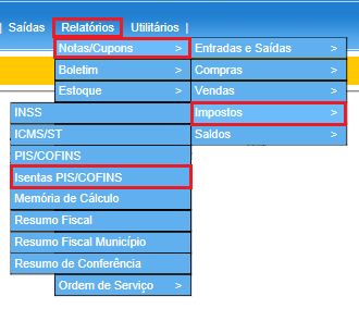 Para acessar este relatório é preciso ir ao Menu “ Relatórios-Notas/Cupons-Impostos-Isentas PIS/COFINS".