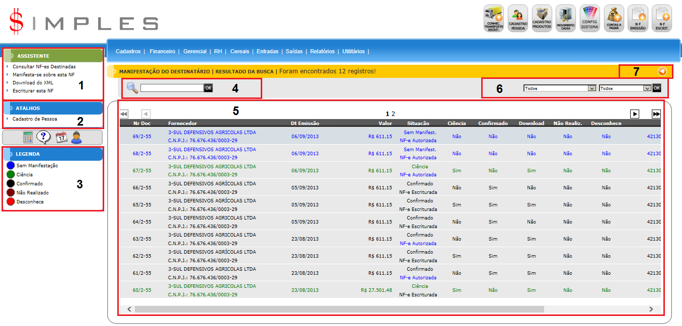 Para acessar Manifest.Destinatário, use o Menu “ Entradas-Manifest.Destinatário”. Será apresentada a tela principal de Manifest.Destinatário.