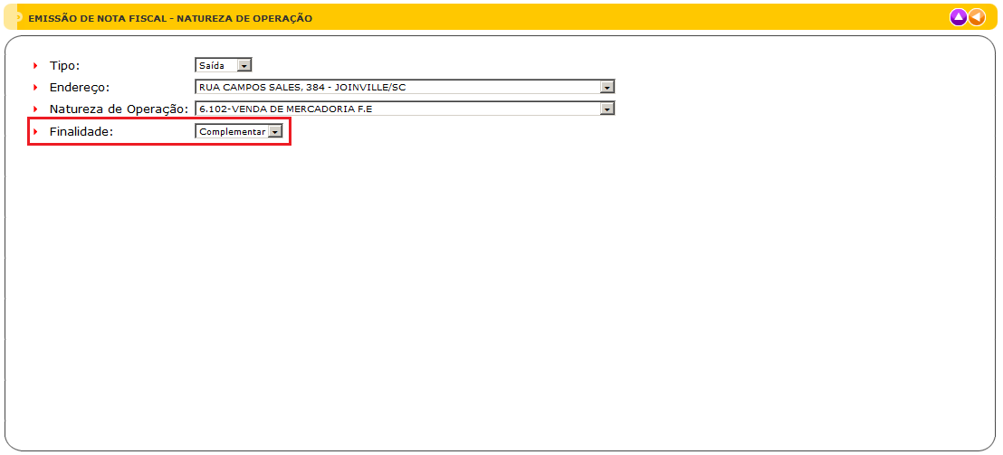 Para emitir uma nota fsical complementar o usuário deve selecionar a mesma natureza de operação da nota que deseja complementar e escolher a finalidade "Complementar".