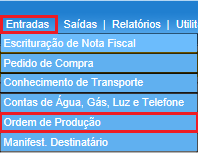 Para acessar Ordem de Produção, use o Menu “ Entradas-Ordem de Produção”. Será apresentada a tela principal de Ordem de Produção.