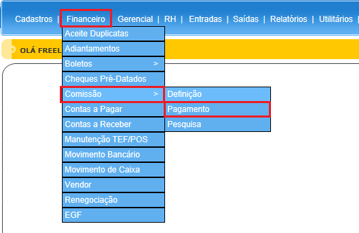 Para acessar Financeiro – Comissão - Pagamento, use o Menu “ Financeiro – Comissão - Pagamento”. Será apresentada a tela principal de Comissão - Pagamento.