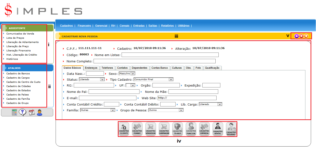 A tela do Cadastro de Pessoa possui quatro elementos principais que executam funções distintas: