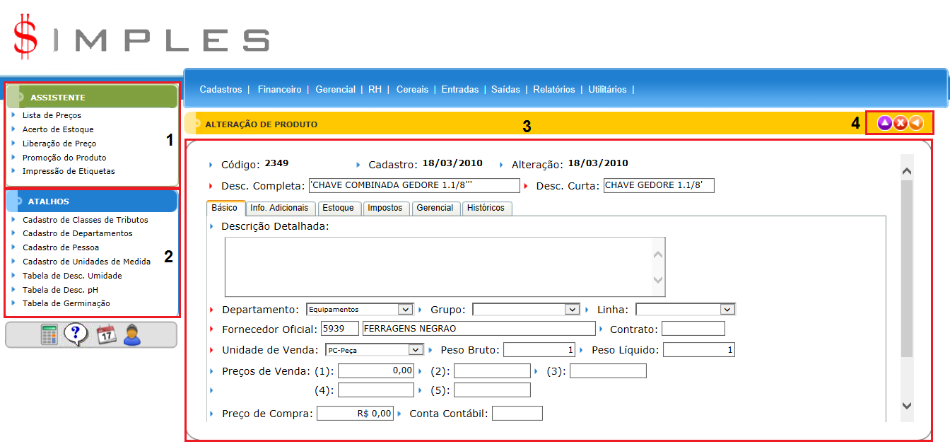 - Básicos: Nesta opção estão apresentados os principais dados do cadastro de produtos, por exemplo, Departamento, Fornecedor e Preços de Venda.