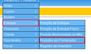 Para acessar este relatório é preciso ir ao Menu “ Relatórios-Estoque-Produtos por Fornecedor”.