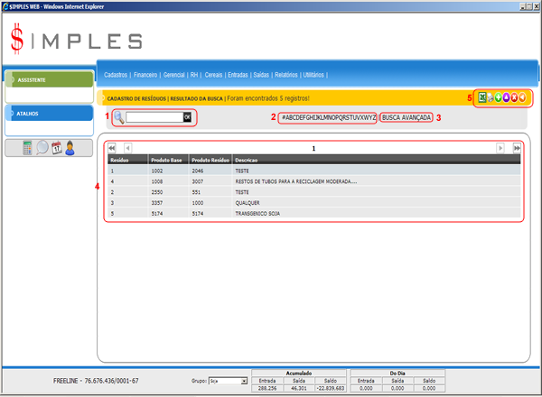 - Grade de Resíduos: Mostra todos os Resíduos conforme os filtros descritos anteriormente.