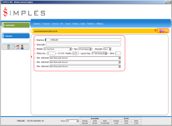 A tela do Cadastro de Séries de NF possui cinco elementos principais que executam funções distintas, conforme seguem: