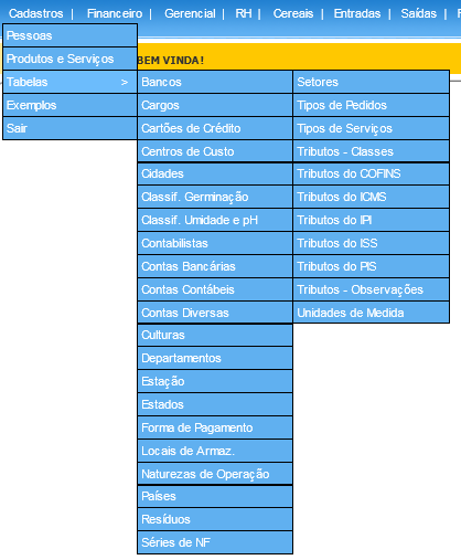 O menu Tabelas agrega todos os cadastros auxiliares ao cadastro de produtos, pessoas, documentos fiscais e financeiro.